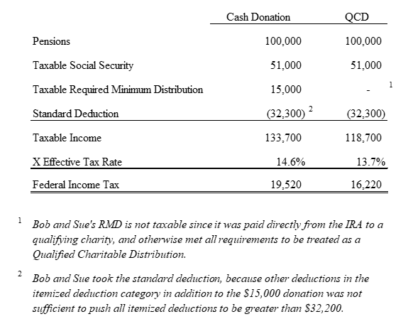 Fortunately, Bob and Sue are very healthy and have very little medical bills. They also have their mortgage paid off and are living debt free in retirement. This also means that they have very little in the way of typical itemized deductions, a category of deductions that includes charitable donations. Taxpayers normally take the most advantageous deduction between the aggregate of all itemized deductions or the standard deduction. Bob and Sue’s standard deduction is $32,300.